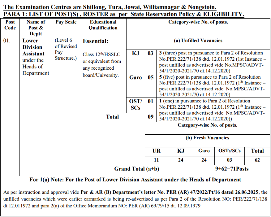| Mode of Submission of Application | Online Application viz www.mpsc.meghalaya.gov.in |
